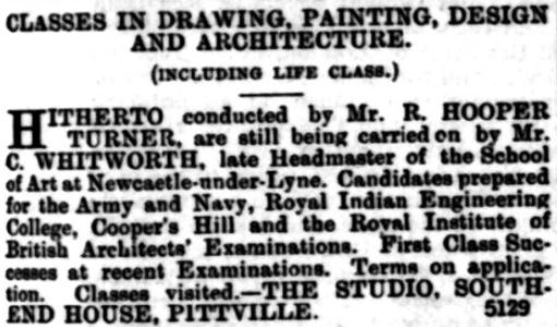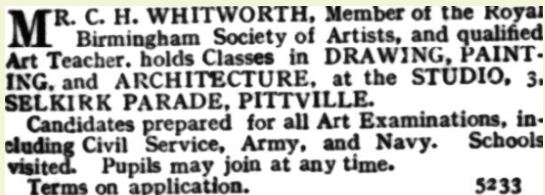 Charles Whitworth’s advertisement for art classes at 3 Selkirk Parade
