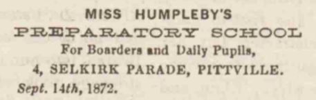 By 1872 Miss Humpleby had moved to Selkirk Parade.