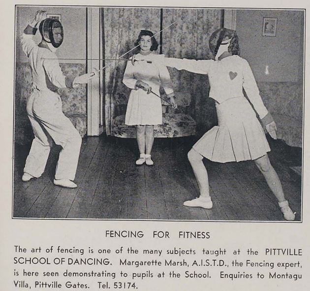 The Pittville School of Dancing was located at Montagu Villa, now 6 Pittville Lawn, and offered classes for both children and adults at several levels. The school started in 1943, offering ‘all that is best in dancing’. Most lessons were in ballet, but in tap-dancing and ballroom-dancing were also offered. As the illustration shows, there were also fencing classes under the instructor Margaret Marsh – fencing was considered good for posture – and a physical culture class for ladies on Monday evenings. The importance of being able to dance is illustrated in several of their many advertisements which read ‘Dancing is such a social asset’. In addition to ‘Strict beginners’ courses’, in October 1950 the school was also offering classes for married couples, so that earlier skills were not lost once one had caught a partner!
