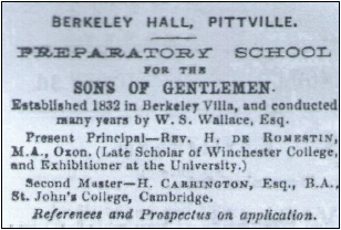 William Samuel Wallace had established his preparatory school for boys in 1832 in his home at Berkeley Villa in Berkeley Street, Cheltenham, but chose to move a short distance in 1867 to the newly built premises in Pittville Circus Road which he named Berkeley Hall, possibly to give an idea of the ample accommodation (twenty rooms) and grounds.