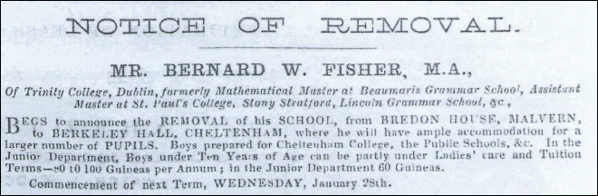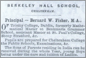 By 1874, the Reverend de Romestin had moved to Oxfordshire, becoming the incumbent of St Mary’s in Freeland. This gave Bernard W. Fisher, M.A. the opportunity to move from Malvern to Berkeley Hall in early 1874 in order to increase the size of his school (some nine pupils in 1871). He offered to prepare boys for Cheltenham College and other public schools, charging 80 to 100 guineas per annum or 60 guineas for juniors.