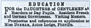The Misses Dynham (two sisters, Frances and Alice) opened their boarding school at Acton Lodge around 1883, with Frances Dynham as principal, and for ten years educated the daughters of gentlemen, with an emphasis on foreign-language teaching.