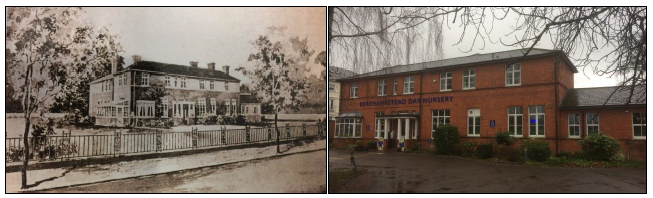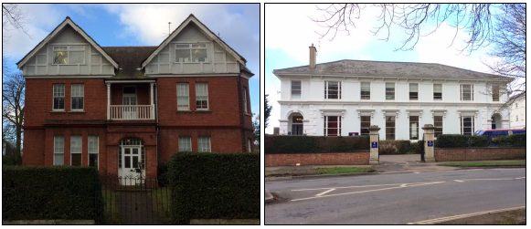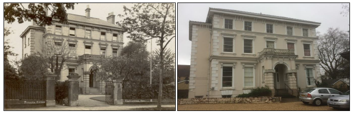 Former premises of Inholmes School, today St Anne’s, Pittville Circus Road, c1920s (Pittville History Works) and 2018