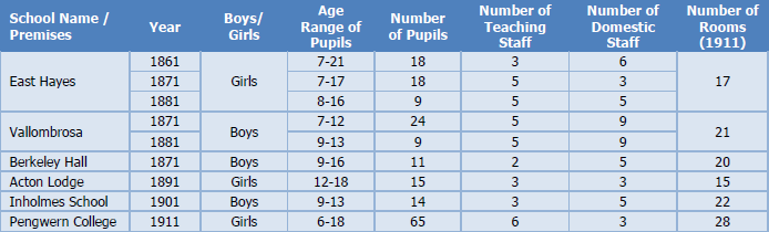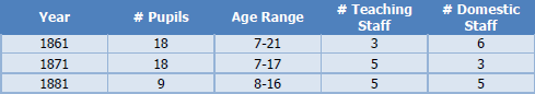 The principals of these schools hailed from outside the town, with not a Cheltonian amongst them, although some did become long-term Pittville residents. Similarly, nearly all the tutors and governesses, as well as most of the pupils, were from outside Cheltenham. People from Gloucestershire accounted for a fairly large proportion of the domestic staff.